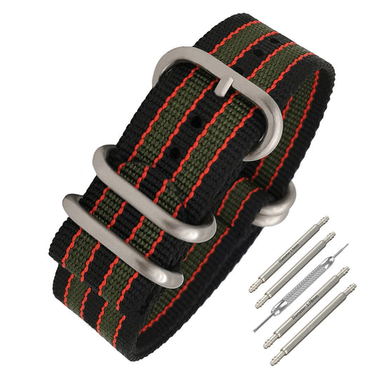 Masar Bracelet Montre ZULU- James Bond Noir-Rouge-Vert - Boucle Satin - Homme - Raide et épais 2mm