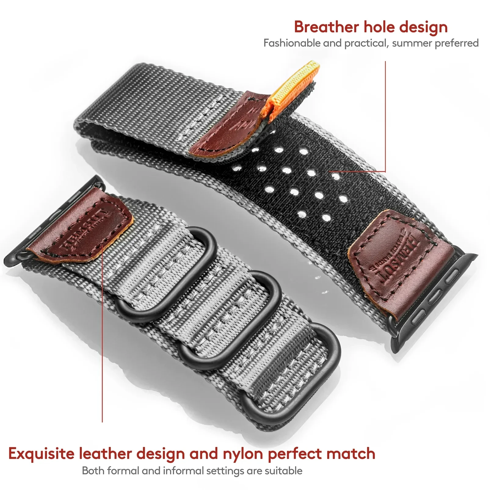 These Apple Watch bands are made of genuine leather, high-quality nylon, and strong Velcro. The three-buckle design allows you to adjust them to different wrist sizes, so you don't have to worry about them not fitting your wrist. Black, orange, yellow, gray, and green colors are available, which would give your watch a summery touch. Try it now.