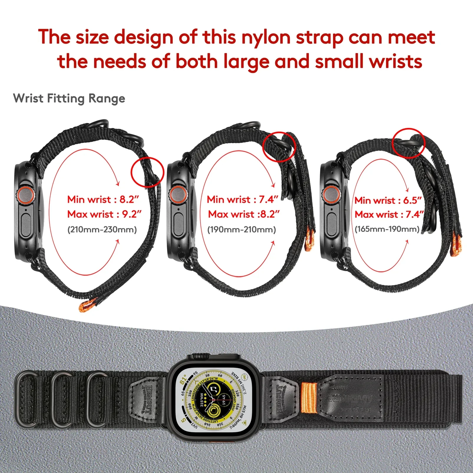 The 49mm Apple Watch Ultra bands are the same size as the 45mm Apple Watch Series 8, 44mm Apple Watch, and 42mm Apple Watches. If you are unsure about which size bands work for Apple Watch Ultra and cannot find 49mm Apple Watch bands in the watch band store, you can select 45mm, 44mm, or 42mm. They will fit your watch perfectly. Smaller Apple Watch sizes can be 38mm and 40mm.