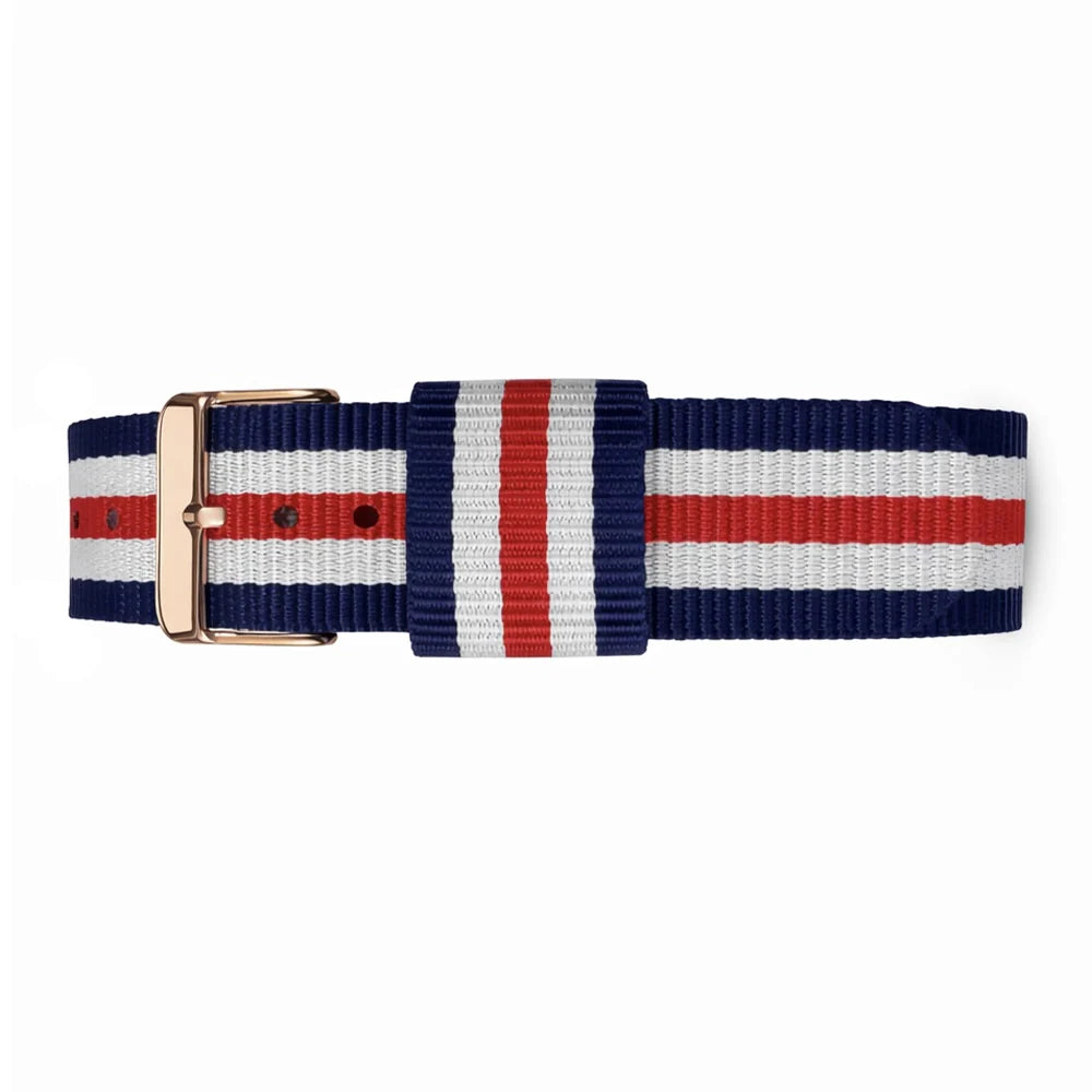 Canterbury Blue, White and Red Nylon NATO Strap with Rose Gold Buckle.