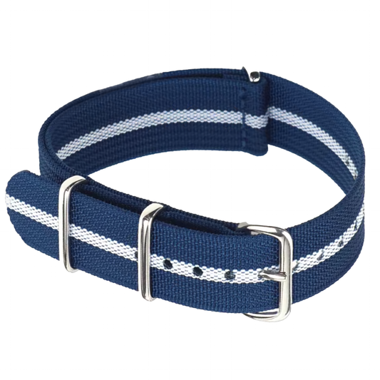 Correa Masar NATO azul y blanca - Tejido de nailon G10 - Hebilla pulida