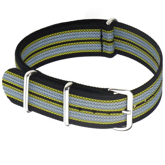 Correa Masar NATO James Bond - Negro, Amarillo y Gris - Tejido de nailon G10 - Hebilla pulida