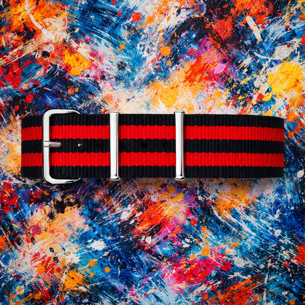 Dona al tuo orologio un look elegante e sobrio con questo cinturino NATO in nylon nero e rosso. Perfetto per orologi leggeri, unisce comfort, flessibilità e un design moderno.