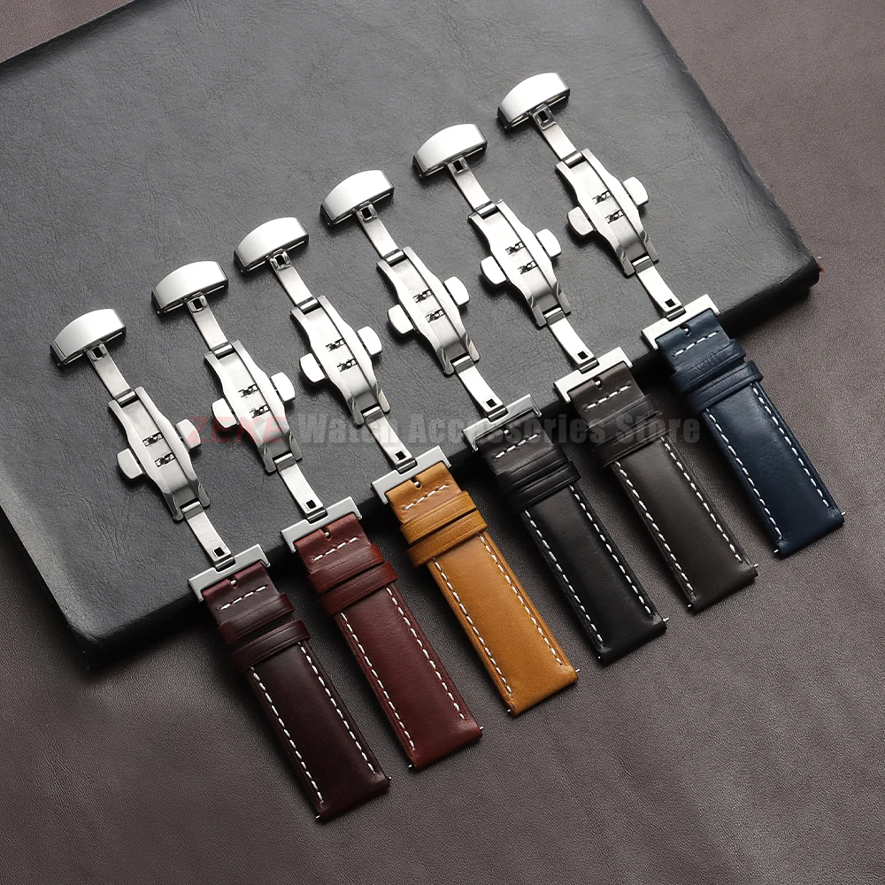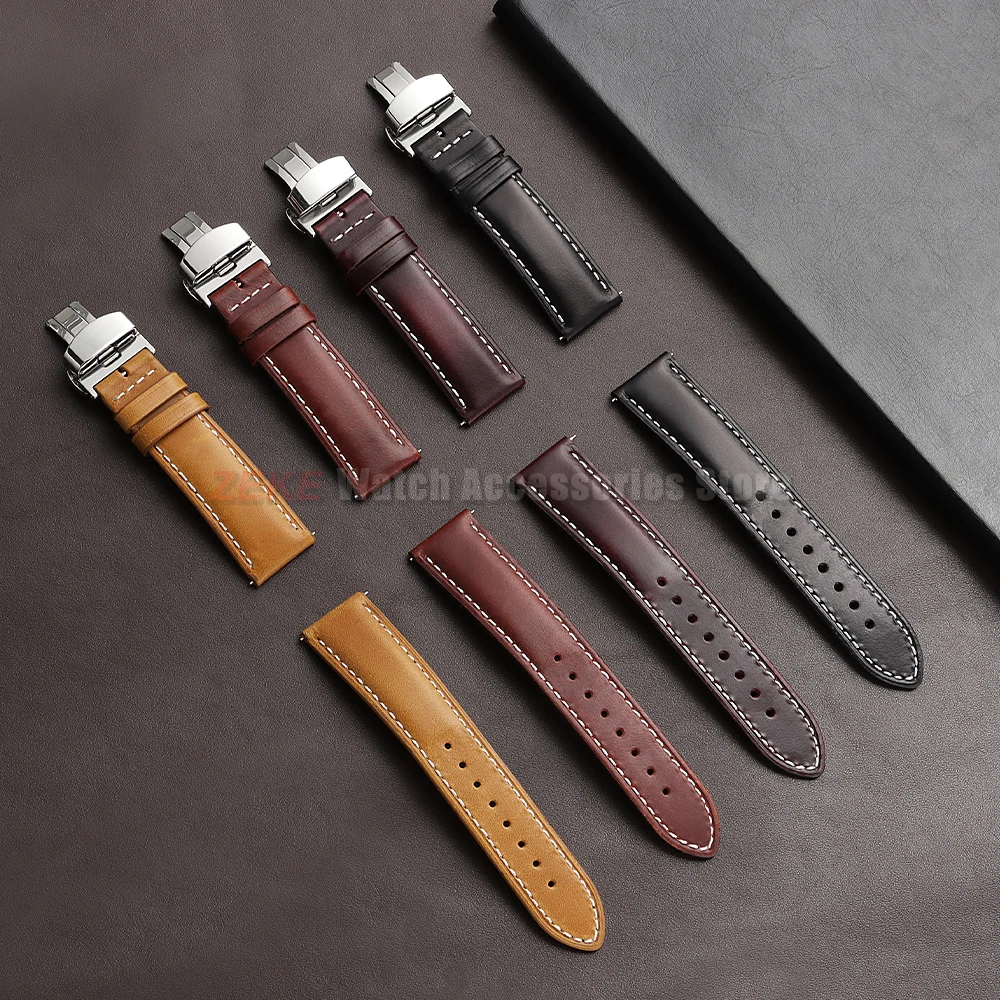 Bracelet de montre Vintage en cuir ciré à l'huile, 18mm 20mm 22mm, couche de tête universelle en cuir de vache, accessoires de Bracelet à boucle papillon