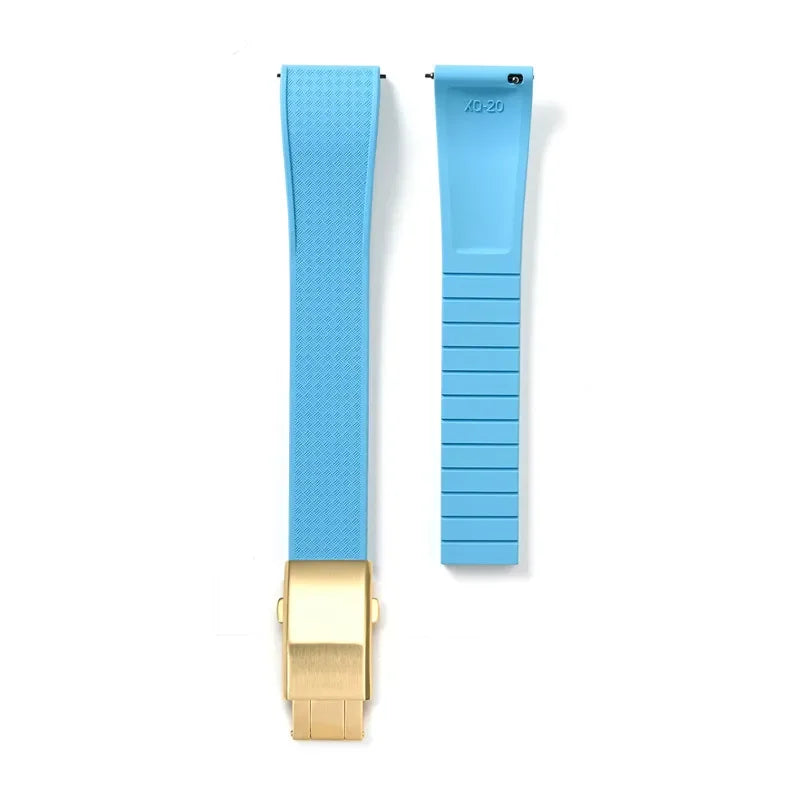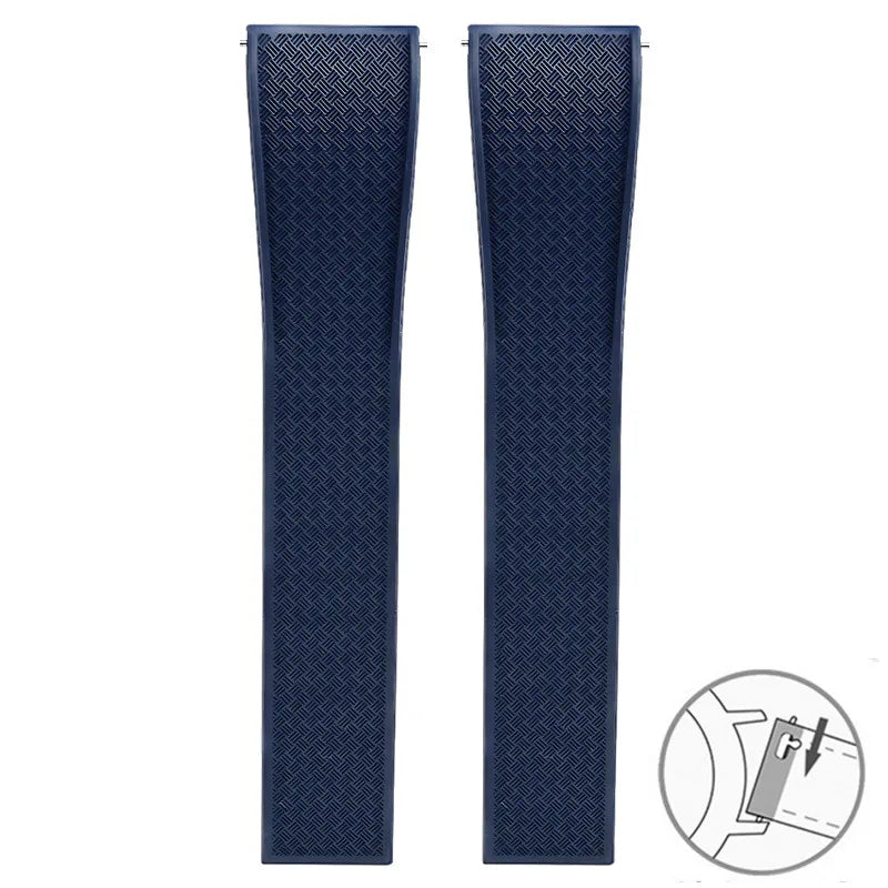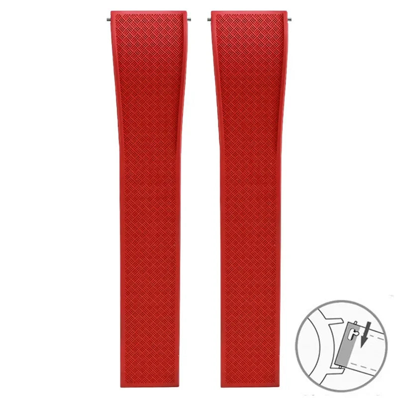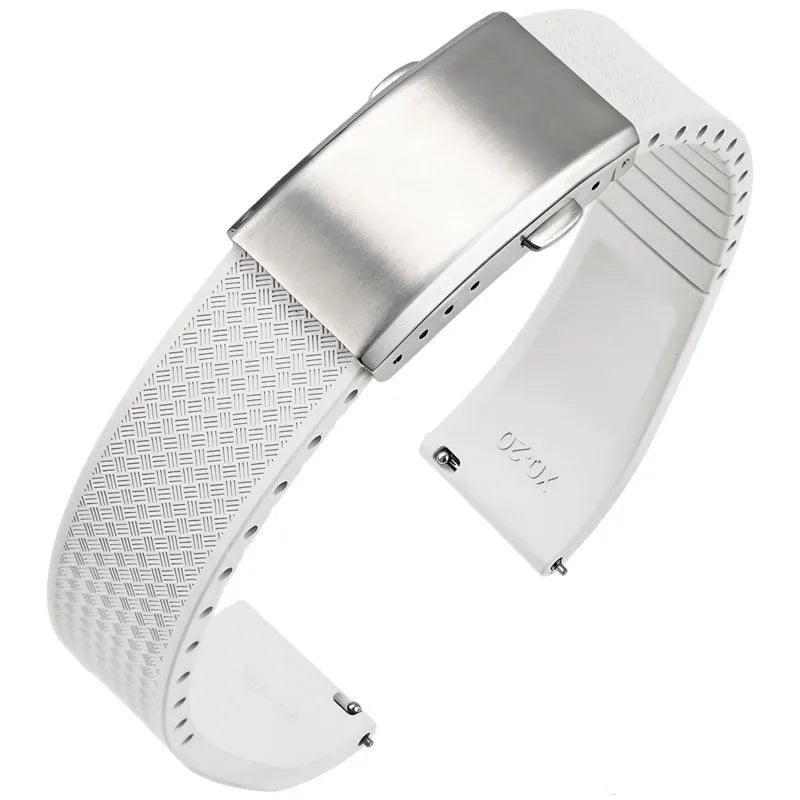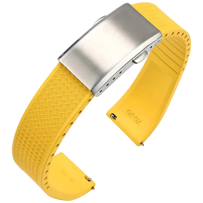 Bracelet de montre en caoutchouc premium, souple, durable et confortable, équipé d’une boucle déployante pour un maintien sécurisé. Son système de dégagement rapide permet de changer le bracelet en quelques secondes, sans outil. La longueur peut être ajustée par découpe pour s’adapter parfaitement à votre poignet.